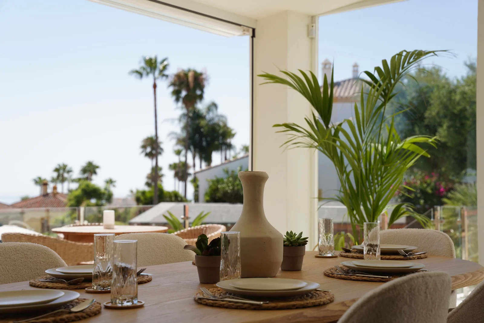 The interior design is based on a contemporary Mediterranean aesthetic, combining clean architectural lines with natural materials and a neutral, warm colour palette.